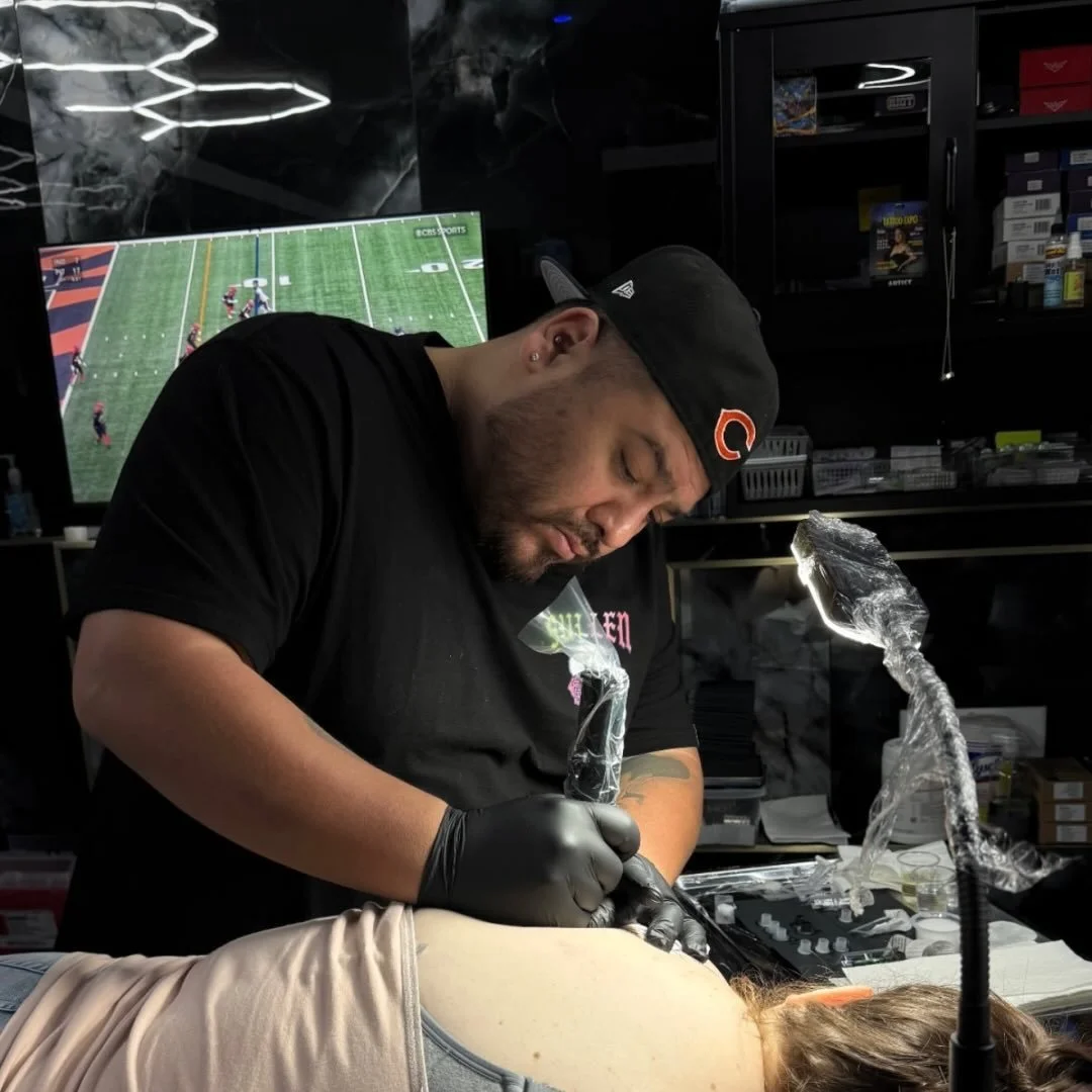 I began my apprenticeship in Laramie, Wyoming, and later found my footing at Medicine Man Tattoo, where I built consistency, confidence, and a deeper understanding of how to design tattoos that hold up over time—both visually and structurally on the body. I specialize in Black & Grey, Illustrative Realism, Script, and Neo-Traditional, with a focus on strong shapes, clear contrast, and pieces that flow naturally and read well from a distance.